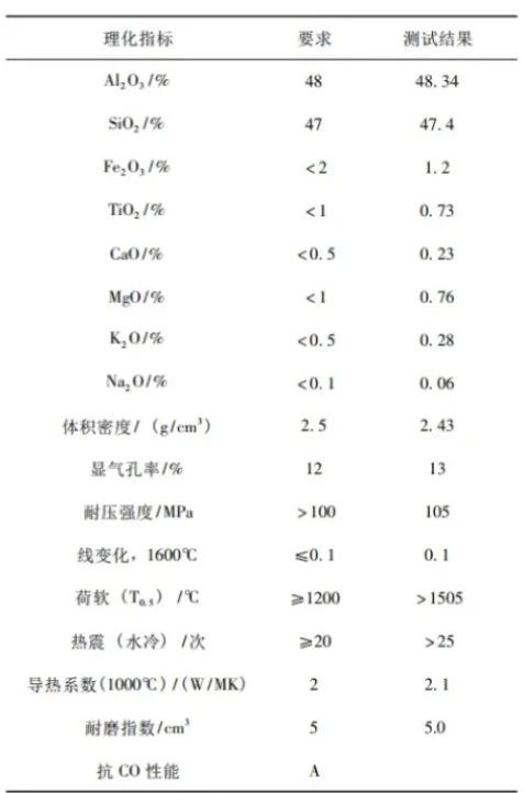 沸騰氯化爐內襯材料主要采用Al₂O₃和SiO₂,物相組成主要為莫來石,主要化學成份及物理性能測試見表1。
