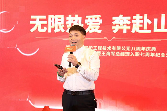 集團(tuán)董事長(zhǎng)楚科奇首先發(fā)表了致辭。他回顧了榮盛窯爐工程八年來(lái)從創(chuàng)業(yè)維艱到行業(yè)頭部的奮斗歷程。他指出,每一份成績(jī)的取得,都凝聚著全體員工的智慧、汗水與“無(wú)限熱愛(ài)”。楚總向入職七周年的王海軍總經(jīng)理表達(dá)敬意與感謝,高度評(píng)價(jià),擁有 領(lǐng)導(dǎo)力和市場(chǎng)洞察力。他特別強(qiáng)調(diào),在王總的帶領(lǐng)下,工程公司今年業(yè)績(jī)超越預(yù)期,創(chuàng)下歷史新高,為公司樹(shù)立了新的發(fā)展標(biāo)桿。同時(shí),楚總也對(duì)朱廣州帶領(lǐng)的工程項(xiàng)目部、白建偉負(fù)責(zé)的生產(chǎn)部以及集團(tuán)管理層表達(dá)了充分肯定,感謝各團(tuán)隊(duì)為公司發(fā)展作出的重要貢獻(xiàn)。最后,楚總號(hào)召全體榮盛人,以八周年為新的起跑線(xiàn),憑借對(duì)事業(yè)的無(wú)限熱愛(ài)與堅(jiān)定信念,共同驅(qū)動(dòng)榮盛巨輪,在時(shí)代的浪潮中破浪前行,開(kāi)辟更加壯麗的征途。